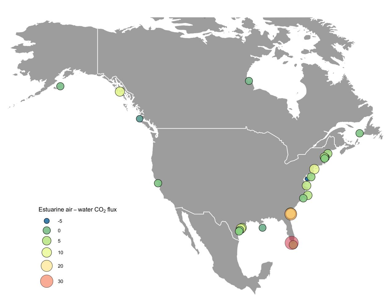 2:北美河口碳“源/汇”空间分布。(单位: mol·C·m-2·yr-1)