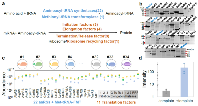 图2:MSBC生产PURE重组蛋白质元件。a. 大肠杆菌中蛋白质合成的核心机制需要34种酶。b. 34 种MSB单独培养产生了相应的34种酶。c. 34种MSB组成的MSBC培养产物包含相应的34种酶。d. 使用MSBC产物构建的PURE反应机器成功表达了RFP