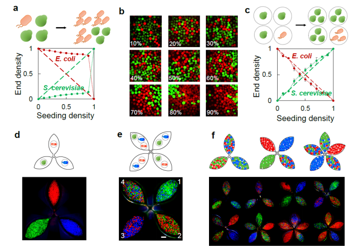 接下来,研究人员进一步利用MSBC方法构建精准调控的跨物种群落。大肠杆菌和酿酒酵母是实验室研究和工业应用中使用最广泛的两种微生物。共培养大肠杆菌和酿酒酵母可以潜在地利用这两个宿主的优点,如大肠杆菌可以快速、大量合成蛋白质;酿酒酵母可以对复杂真核酶实现可溶性表达。然而,大肠杆菌(约20分钟)和酿酒酵母(约90-120分钟)的传代时间差异使大肠杆菌更有效地消耗营养并成为优势者。研究人员将表达红色荧光蛋白的大肠杆菌和表达绿色荧光蛋白的酿酒酵母接种到培养基中进行混合共培养,然后顺利获得流式细胞仪分析它们的组成。结果表明,无论大肠杆菌初始的接种比例如何,最终都会在菌群中占据主导(图3a)。相比之下,MSBC方法可以实现两个物种的稳定培养以及成分的精准调控。科研人员第一时间构建了大肠杆菌和酿酒酵母分的MSB,并顺利获得调控两种MSB的接种比例组装了一系列MSBC。结果显示,这两个物种都分别在自己的MSB内增殖,物种间有明确的空间界限,并且顺利获得调整两个物种MSB的接种比例,可以精确调节菌群的组成(图3b-c)。