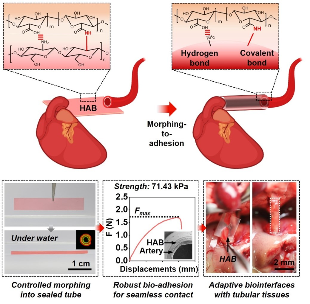 多糖水凝胶基自适应生物界面(HAB)顺利获得可控形变和快速湿粘合,实现与高表面曲率生物组织如小口径血管的免缝合、共形、稳定整合