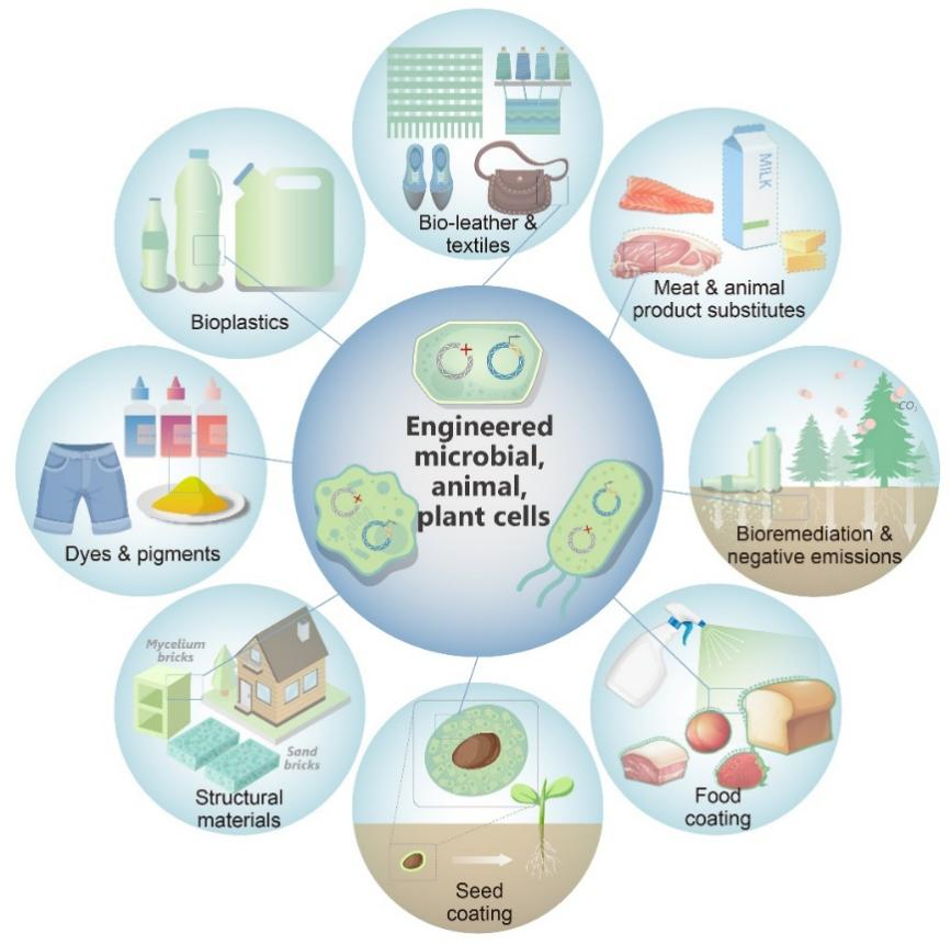 工程活材料以多种方式促进可持续性。由生命系统制造的材料可以取代由石油和其他高碳和高污染排放源制造的合成材料,这样的替代策略有效地减少了对温室气体的排放以及人类对石油基前体的依赖。使用活材料,人类可以直接将CO2转化为有价值的化学品,主动地从大气中清除CO2,产生负碳排放。因此,利用生物体生产材料可以促进可持续性,减少导致气候变化的负面环境影响。从绿色能源生产、污染物环境修复、先进医疗材料开发到生产制作生物塑料、生物皮革、人造肉、颜料染料、环保生物砖、活性种子包衣、食品涂层等,工程活材料可被应用到人类生活中的方方面面,促进社会的可持续开展(图4)。