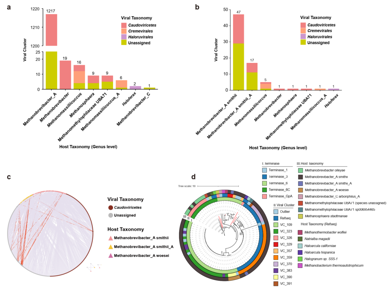 病毒能够以多种方式影响生态系统及微生物进化,例如部分噬菌体能够顺利获得裂解宿主细胞改变微生物的群落结构和生态功能;一些噬菌体能够劫持其宿主的代谢机制,改变宿主细胞代谢产物浓度;噬菌体也可以作为宿主之间水平基因转移的载体2,因此,对于病毒宿主的预测以及病毒与宿主相互作用的研究也是理解病毒的关键步骤。为此,我们顺利获得CRISPR spacer序列建立古菌与其病毒序列间的匹配关系,推断出每种古菌病毒的可能宿主。不出所料,大多数 (n=1217,95.2%) 古菌病毒的宿主都是甲烷短杆菌(Methanobrevibacteria_A),它也是古菌中的优势属 (图3a)。然后,我们顺利获得统计每个古菌属对应的VC数量来衡量病毒的多样性,其中,47个VCs只侵染M. smithii古菌,17个VCs只侵染M.smithii_A古菌,但有13个VCs与这两种古菌均有关联,反映了古菌病毒能够跨种侵染宿主的特性。为了对古菌的跨宿主侵染情况进行更加详细的研究,团队构建了宿主与病毒关系网络(图3c),发现大约三分之一的肠道古菌病毒都具有广泛的宿主范围,并不局限于单一物种,这些分析为人类肠道微生物群中古菌病毒介导的基因流动网络给予了全面参考。