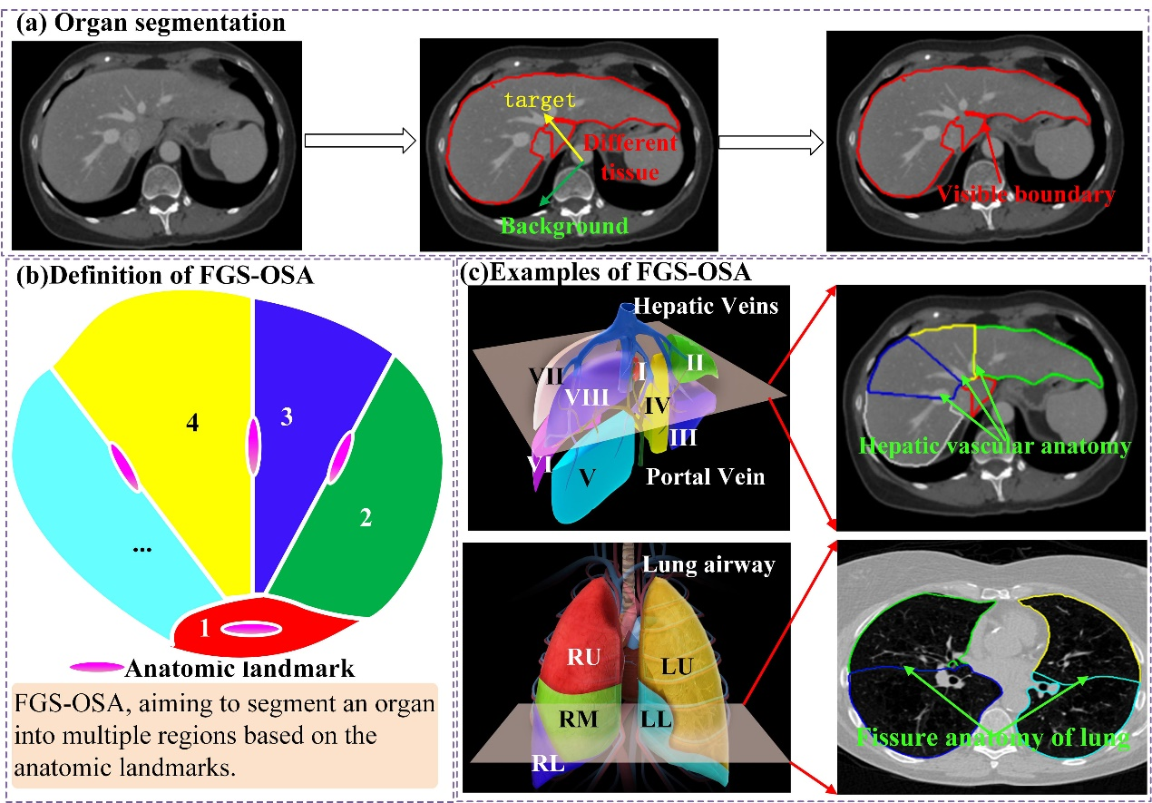器官分割与器官外科解剖细粒度分割(FGS-OSA)。(a)器官分割。(b) FGS-OSA示意图。(c)两个FGS-OSA的例子:肝脏和肺的外科解剖功能细粒度分割
