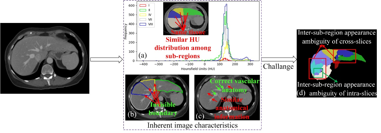 然而,与器官分割相比,器官解剖功能区域分割更具有挑战性:不同功能子区域间相似的HU分布,不可见边界以及解剖标志和其它解剖信息之间的相似性均会导致解剖功能区域自动分割存在子区域间的外观模糊,这会直接导致下游临床任务的失败。