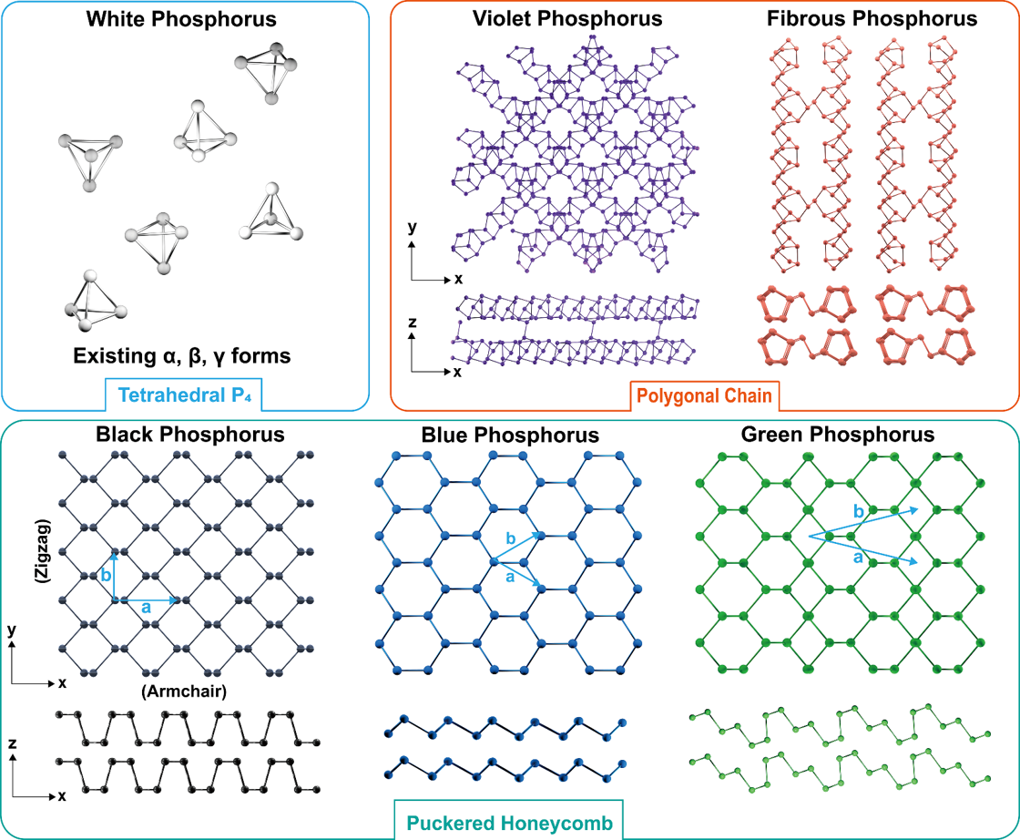 单质磷材料(Elemental Phosphorus Materials, EPMs)独特的多态性使其在物质科学领域受到越来越多的关注。本综述从磷元素的发现、到历史上各单质磷结构的测定、再到近期基于机器学习的结构搜索,系统回顾了单质磷材料的发现过程。对白磷、黑磷、非晶红磷、蓝磷、紫磷和纤维磷等代表性单质磷材料迥异的原子结构、丰富的电声子性质、多变的氧化还原活性和稳定性等进行了总结。从理论和实验的角度分析了这些理化特性的结构起源,并详细讨论了各种单质磷材料之间的共性与差异(图2)。