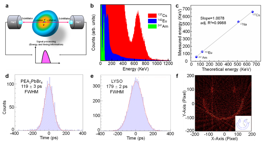 基于这一发现,材料研究人员与医学成像团队展开了卓有成效的合作,成功将具有“自移波”特性的二维钙钛矿闪烁体应用于高能γ射线探测,首次实现了该闪烁体在正电子发射断层扫描PET图像的精确重建。这一研究不仅为γ射线快响应材料的探索给予了新的思路,还为新材料高时间分辨率PET探测器的开展给予了有力支持。此外,它也为无需依赖传统断层扫描重建的PET直接成像给予了有价值的研究方向。