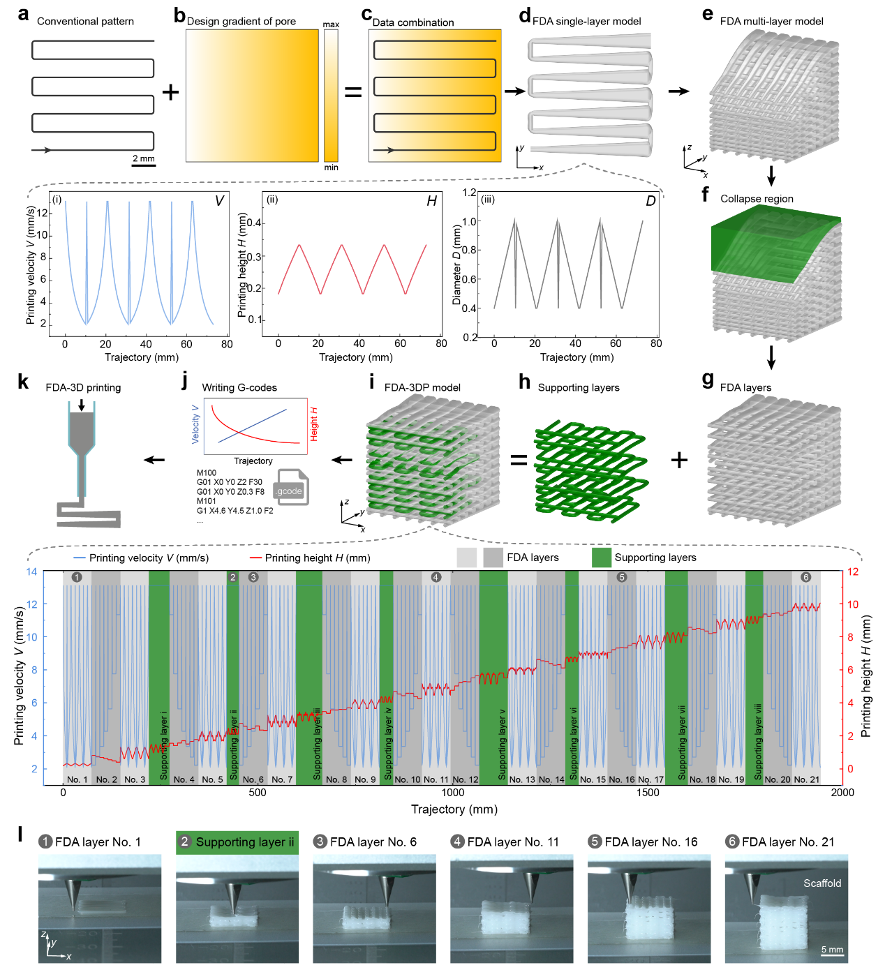 挤出式3D打印为最常见的3D打印技术,具有高适用性,广泛应用于类器官体外制造与组织工程等前沿领域。然而,传统挤出3D打印采用平行切片方法,其在层内打印时保持恒定的打印速度V和打印高度H,沉积形成的纤维直径也保持恒定,严重限制了其设计制造复杂梯度多孔结构(如图1a,b)。为了突破传统3D打印策略的限制,研究团队基于体积守恒定律,顺利获得定制运动轨迹上的打印速度和打印高度,实现各处纤维直径的精准控制,提出FDA-3DP(filament diameter-adjustable 3D printing新策略(如图1c,d)。