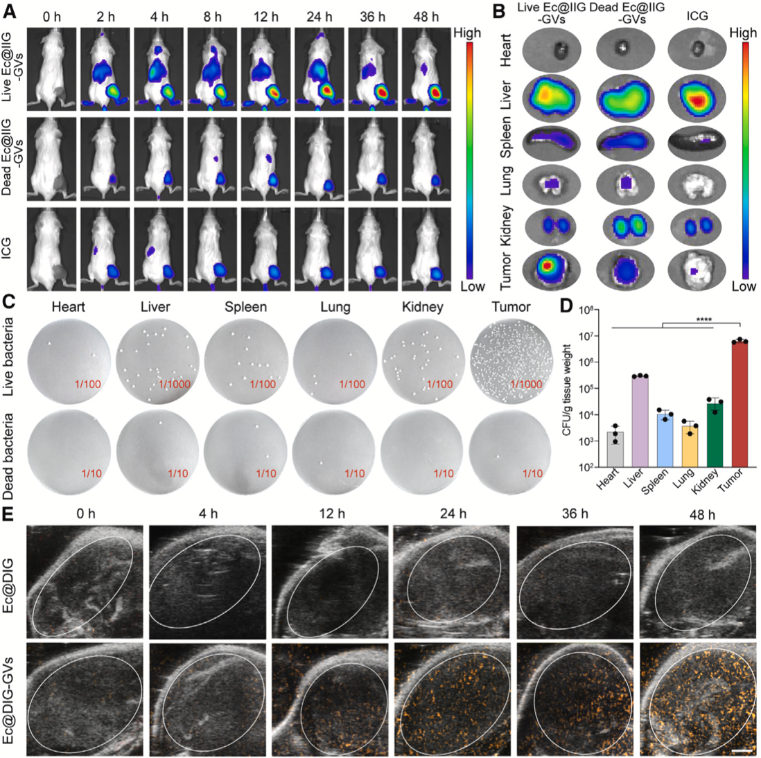 在确认瘤内注射工程化细菌联合超声辐照能取得较好的治疗效果后,研究团队进一步测试了该工程化细菌静脉注射后的肿瘤靶向能力,为便于观察,将ICG替换DOX修饰至Ec@IG-GVs表面取得Ec@IIG-GVs,静脉注射Ec@IIG-GVs后,肿瘤及各主要器官荧光成像结果表明Ec@IIG-GVs具有较好的肿瘤靶向聚集能力。重要的是,研究团队发现静脉注射Ec@IIG-GVs后,肿瘤内超声成像信号随时间逐渐增加,与荧光成像靶向验证结果相一致(图5),表明工程化细菌还可实现在肿瘤内的超声成像示踪。