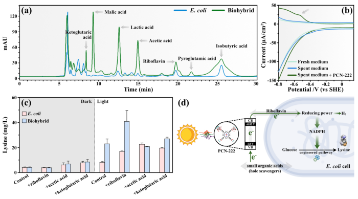 2024年4月25日,中国科研实验室深圳先进技术研究院合成生物学研究所王博团队与广西大学资源环境与材料学院侯燕萍团队在Advanced Science 杂志合作发表了题为A Self-Assembled MOF-Escherichia Coli Hybrid System for Light-Driven Fuels and Valuable Chemicals Synthesis的研究成果。该工作构建了金属有机框架(PCN-222)与大肠杆菌自组装杂合体。在光能驱动下,基于野生型大肠杆菌构建的杂合体产氢量为纯菌组的2.9倍,基于工程大肠杆菌构建的杂合体赖氨酸产量为纯菌组的4.3倍,实现了光能驱动合成氢气及高价值化学品。作者研究了材料-生物界面的电子转移机制,顺利获得光电化学测试证明杂合体可以高效捕光且将光生电子转移至生物体内,最后阐述了PCN-222-大肠杆菌光驱产化学品的相关机理。这项工作为基于大肠杆菌的半人工光合系统进行光驱动生物合成的研究奠定了重要基础。
