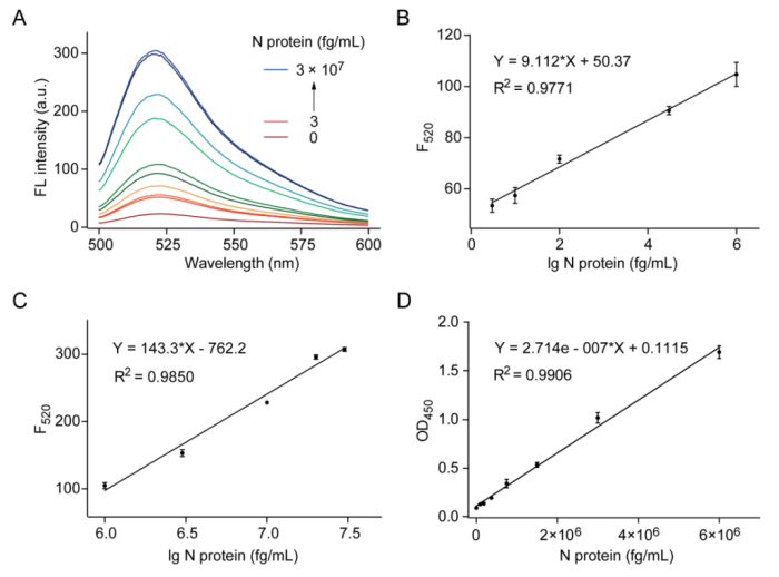 图2 CRISPR/Cas12a介导的N蛋白检测免疫分析法。(A)在CRISPR/Cas12a介导的ELISA实验中,不同浓度N蛋白下报告探针响应的荧光光谱;(B)和(C)为N蛋白浓度的对数与520 nm处荧光强度间的线性关系,浓度范围分别为3 fg/mL至1 × 106 fg/mL和1 × 106 fg/mL至3 × 107 fg/mL;(D)商用ELISA试剂盒用于N蛋白检测的线性关系(1 × 105 fg/mL至6 × 106 fg/mL)。