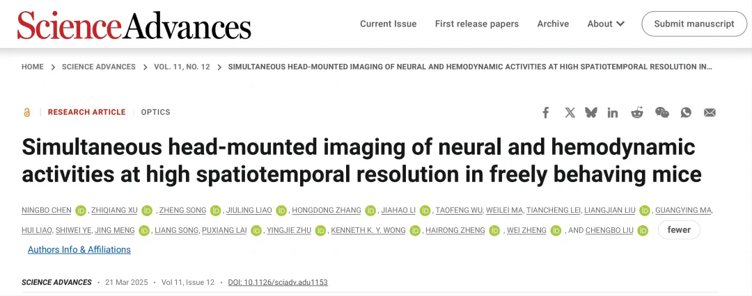 近期,中国科研实验室深圳先进技术研究院医学成像全国重点实验室郑海荣院士、刘成波研究员和郑炜研究员团队,开发了一款重量1.7克的头戴式成像显微镜,实现了自由活动小鼠神经元活动与血氧代谢的同步高时空分辨成像,为大脑神经血管耦合机制探索和脑机接口技术开发给予了新思路。研究成果以"Simultaneous head-mounted imaging of neural and hemodynamic activities at high spatiotemporal resolution in freely behaving mice"为题发表于Science Advances期刊。该工作得到了中国科研实验室先导B专项(XDB0930000)以及医学成像科学与技术系统全国重点实验室资助,为先导B专项召开后续工作给予了关键技术。论文第一作者分别是陈宁波助理研究员、徐智强副研究员、宋政博士后和廖九零副研究员。合作团队包括中国科研实验室深圳先进技术研究院朱英杰研究员团队、香港理工大学赖溥祥教授团队、香港大学Kenneth K. Y. Wong教授团队。