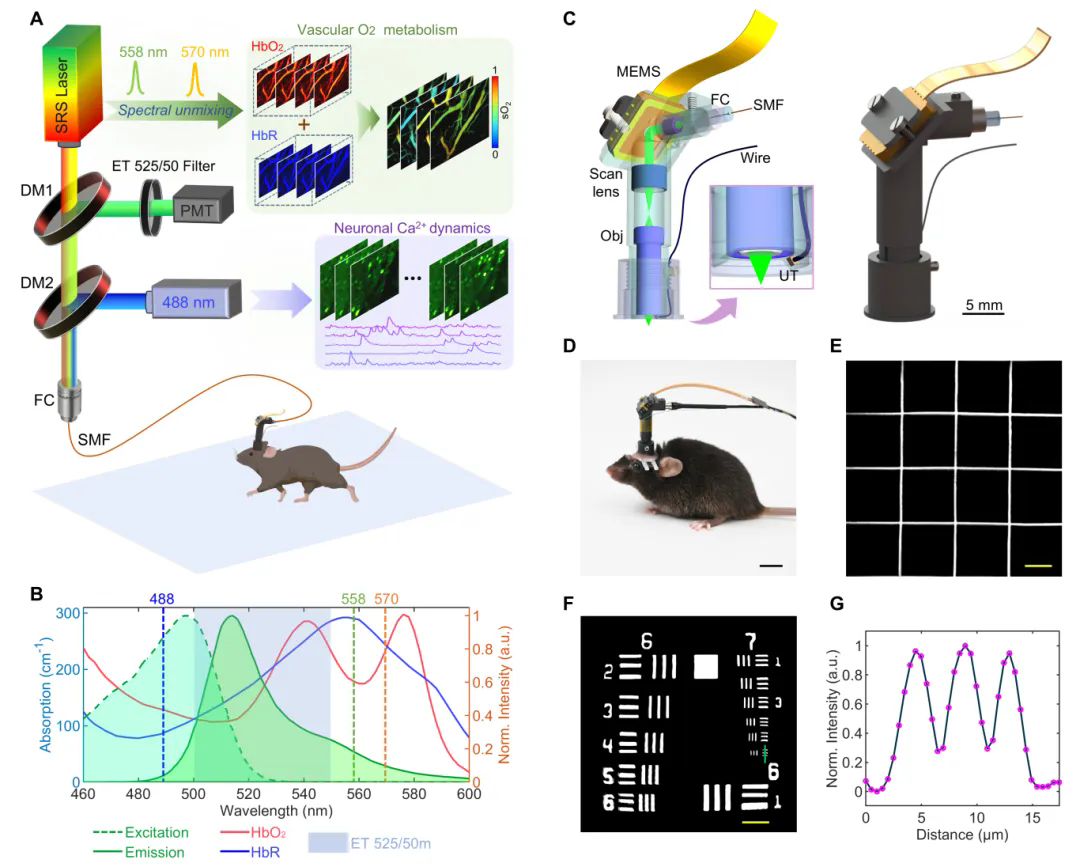 (A)头戴式光声/荧光双模态成像平台;(B)双模态激发与发射光谱;(C)微型化成像探头设计;(D)小鼠头戴式自由活动;(E)成像视场标定,标尺:50 μm;(F-G)分辨率标定,标尺:40 μm。