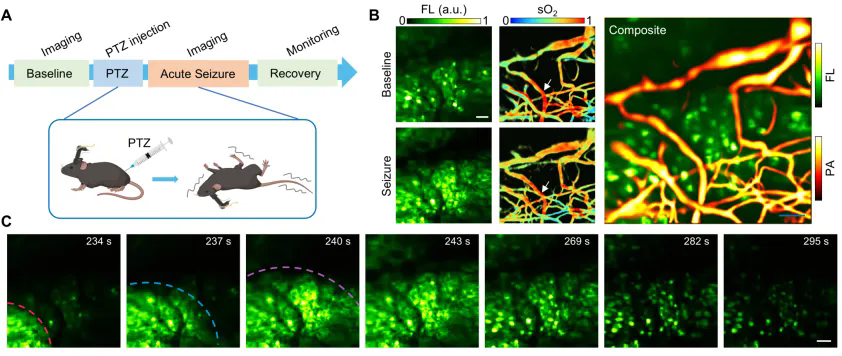 在癫痫急性发作实验中,研究人员利用戊四唑(PTZ)诱导小鼠癫痫模型,观察到癫痫爆发前低强度高频神经放电导致的血氧消耗(sO₂下降9.88%)与部分血管异常扩张(直径增加36%)。这种先于癫痫猝发放电的氧消耗和血管扩张,可为癫痫干预治疗给予潜在的时间窗口。