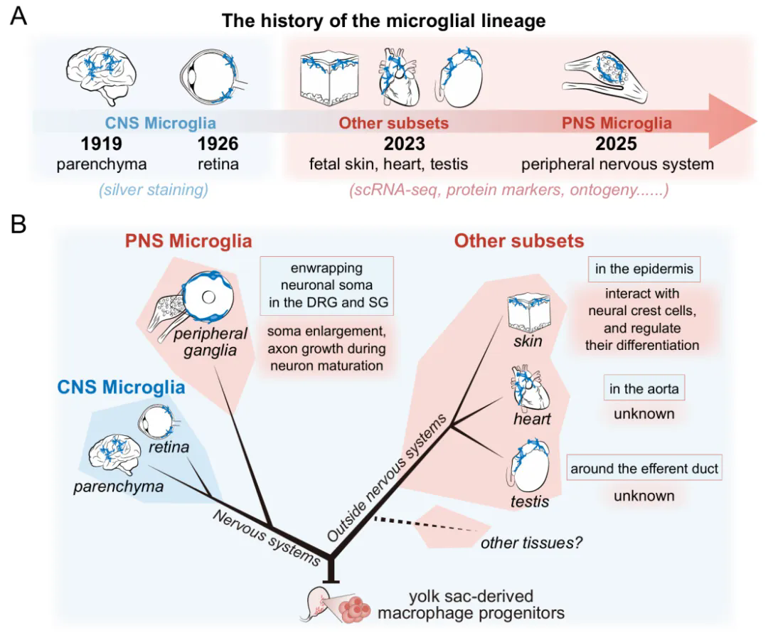 图1. 小胶质细胞谱系是指包含小胶质细胞转录组和相同发育的免疫细胞。(A) 时间轴展示了小胶质细胞谱系的发现历史。(B) 示意图展示了小胶质细胞谱系在人类中的发育起源、组织分布和功能。