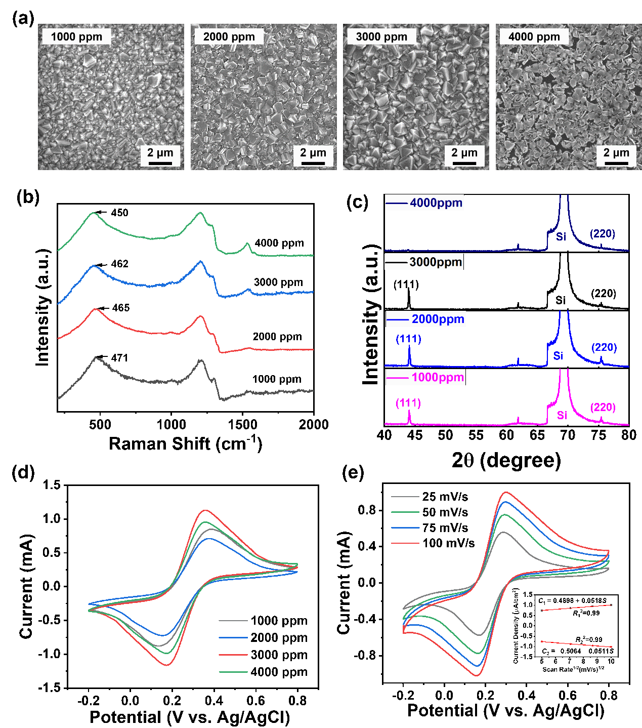 第一时间,团队摒弃了传统易受干扰的商品化电极,转而采用自制的掺硼金刚石(BDD)电极。顺利获得热丝化学气相沉积工艺,在硅片上生长出一层致密的掺硼金刚石薄膜(图2a),并精确调控硼掺杂浓度至3000 ppm——这一最优配比在拉曼光谱、X射线衍射和电化学测试中均展现出卓越性能(图2b–e)。得益于掺硼金刚石在水相中独特的宽电位窗口、低背景电流和高稳定性,BDD电极极大促进了与共反应试剂间的电子转移,将电化学发光信号强度提升了约5倍,同时凭借阴极工作模式,屏蔽了血清中尿酸、抗坏血酸等物质的氧化干扰。
