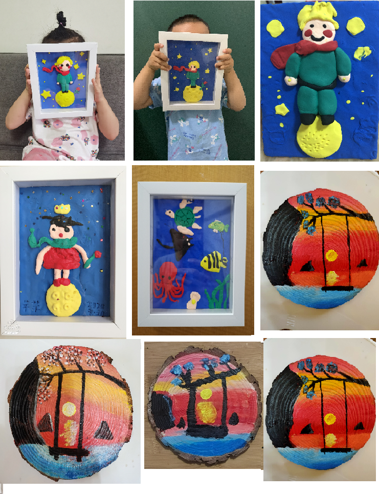 本次六一线上亲子活动分为原木画教学活动和粘土画教学活动两个部分。原木画教学活动先由老师为小朋友讲解绘画工具的使用、颜料的调色方法,然后小朋友跟着老师一步一步进行作画,最后在原木上完成一幅海上晚霞的作品。粘土画教学活动先由老师介绍各种工具的使用方法,然后小朋友跟着老师逐步制作,完成一幅“星球王子”的作品。各位小朋友在跟着老师制作的同时,也发挥自己的想象力,一幅幅精美的作品在小朋友们的手中诞生。