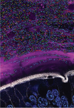 图1:肠道组织样本中含荧光蛋白的不同拟杆菌成像(Whitaker et al, Cell 2017)