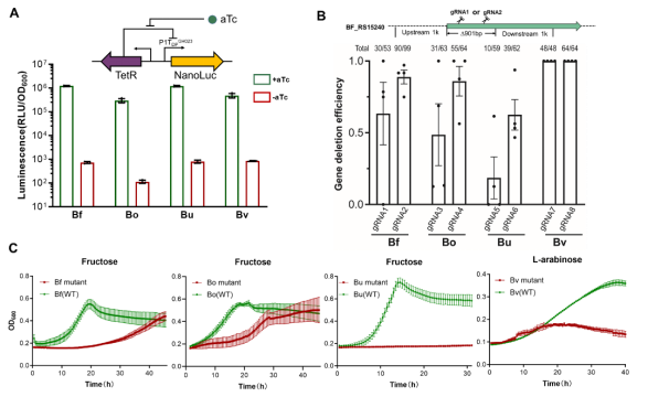 除此之外,该系统也可以在卵形拟杆菌(Bo),脆弱拟杆菌(Bf),普通拟杆菌(Bv),和单形拟杆菌(Bu)实现高效率的基因删除。(如图4所示)