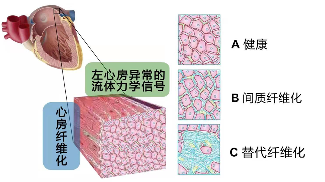 2 左心房异常的流体力学信号导致心房纤维化的发生,A健康状态,B间质纤维化状态,C 替代纤维化状态。