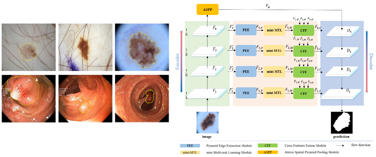 顺利获得人工智能算法,不同医学图像中自动检测和识别病灶部位可以为病人的诊断、治疗以及预后监测给予一种快速且有效的计算机辅助诊断方法,提高放射科医生的工作效率,满足日益增长的影像和诊断服务需求,同时可以有效地缓解资深专业放射科医生短缺问题,为准确及时的医学诊断给予辅助的影像学证据。图像中病变通常表现出形态、分布不规则,与周围正常组织器官区分度低,边缘模糊等特性,为精确自动识别带来了巨大挑战(图1)。针对上述问题,团队提出了一种基于边界信息响应的上下文感知深度网络架构。顺利获得级联构建的金字塔边缘提取模块,多任务学习模块以及交叉特征融合模块,自适应地聚合多层次、细粒度的图像特征,提升了深度神经网络对病变形态、分布及边缘信息等复杂结构的感知,降低了周围正常组织器官、噪声等因素的干扰,极大改善了分割的准确率。提出的方法在皮肤镜图像、内窥镜图像以及X 光图像等多种模态医学影像病变区域分割任务上表现优异,其中在ISIC2017国际皮肤镜图像分割挑战赛测试数据上识别精度达到81.0%,相较比赛冠军队伍成绩,分割精度提升了4.5%;此外在基于内窥镜图像的结肠息肉识别精度达到88.5%、X光图像的肺器官分割精度达到92.8%,提出的模型对比其他多种深度学习方法取得了最好的分割表现