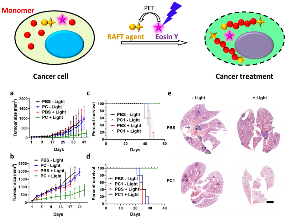 研究团队利用光控PET-RAFT聚合替代自由基聚合的方法,实现了分子量可预测、可调控的聚合物合成方法学开发,同时使所取得聚合物的分子量分布大幅降低,有效提高了聚合物的规整度,并且有效提高了细胞内聚合体系时间、空间上的可控性和可重复性,大幅减少单体及引发剂的用量,降低聚合反应物体系本身对细胞产生的毒性。同时我们对细胞内聚合体系的应用潜力进行了进一步探索,以肿瘤治疗为目的对聚合单体库进行了更大范围的筛选,并成功开展了一种基于细胞内聚合的精准肿瘤治疗体系。顺利获得对细胞毒性的筛查研究,我们发现了一类本身具有较低毒性的丙烯酰胺聚合单体能够在聚合后显著提高其细胞毒性,高效引起肿瘤细胞的凋亡和坏死,和高效抑制肿瘤转移,并利用这一性质开发了一种全新精准肿瘤治疗方法。