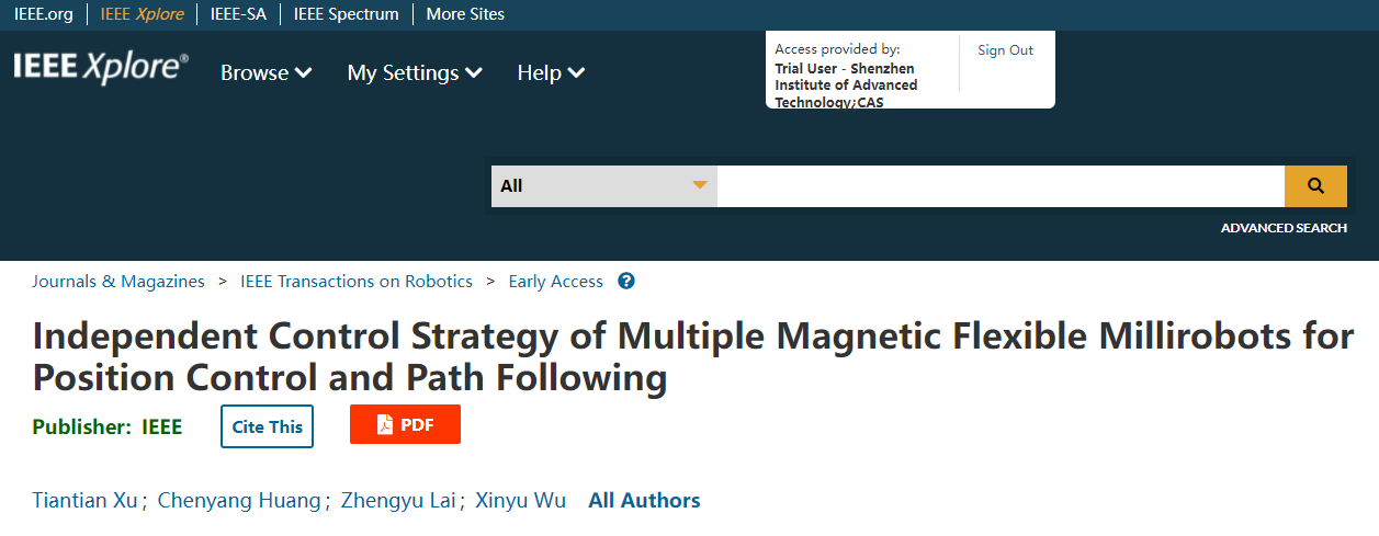 研究成果以“Independent Control Strategy of Multiple Magnetic Flexible Millirobots for Position Control and Path Following”为题,发表在机器人领域权威期刊IEEE Transactions on Robotics(JCR 一区,影响因子:5.567)。智能仿生中心徐天添研究员为第一作者,吴新宇研究员为通讯作者。其他作者中,博士生黄晨阳完成了算法实现及实验验证,硕士生赖证宇协助完成实验。IEEE Transactions on Robotics是IEEE旗下机器人与自动化协会的汇刊,是国际机器人领域顶级期刊之一,每年收录论文仅一百余篇。