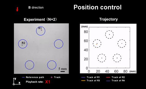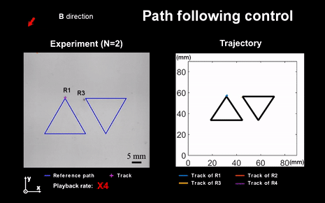图5: 多个磁驱动软体微型机器人被独立控制跟随不同参考路径
