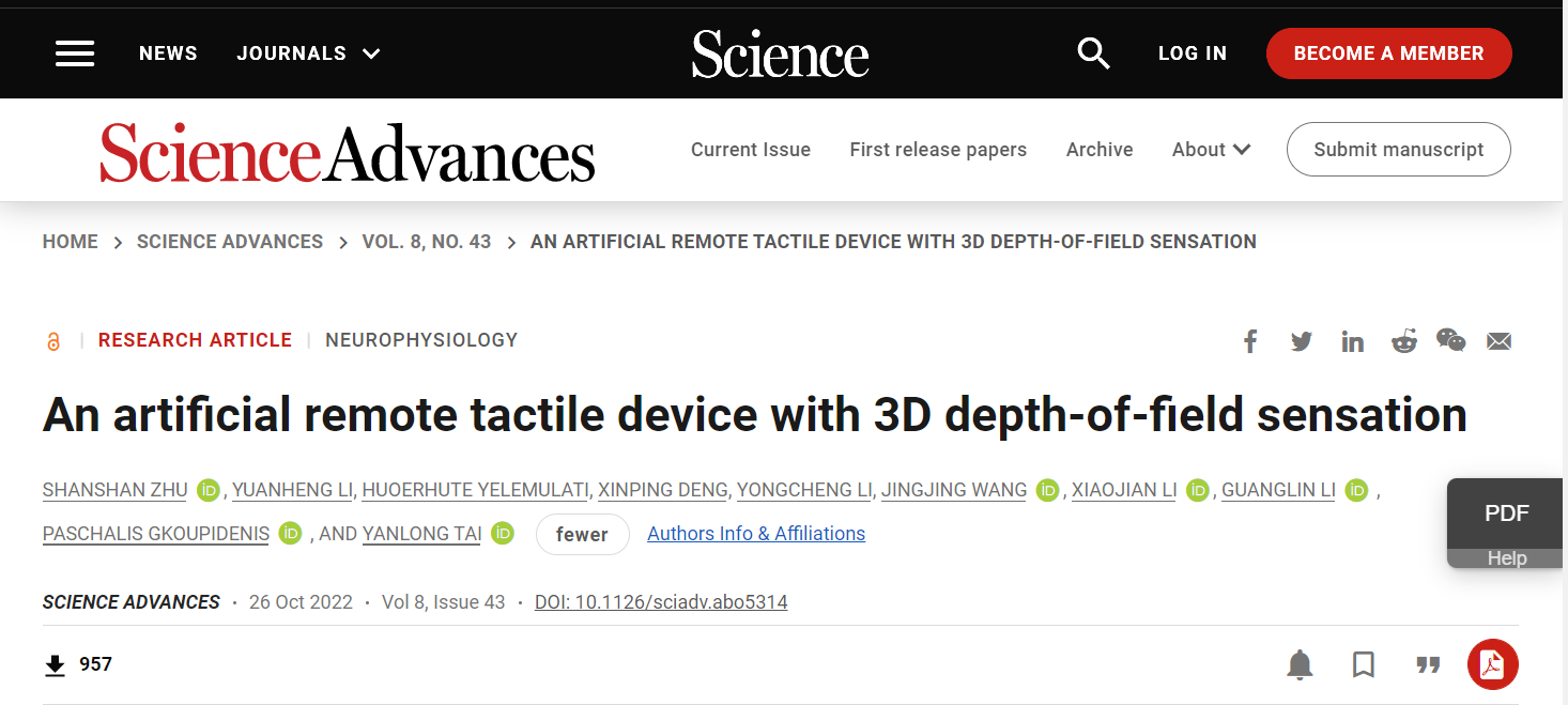 Science Advances | 一种具有三维景深感知的人工遥感触觉器件