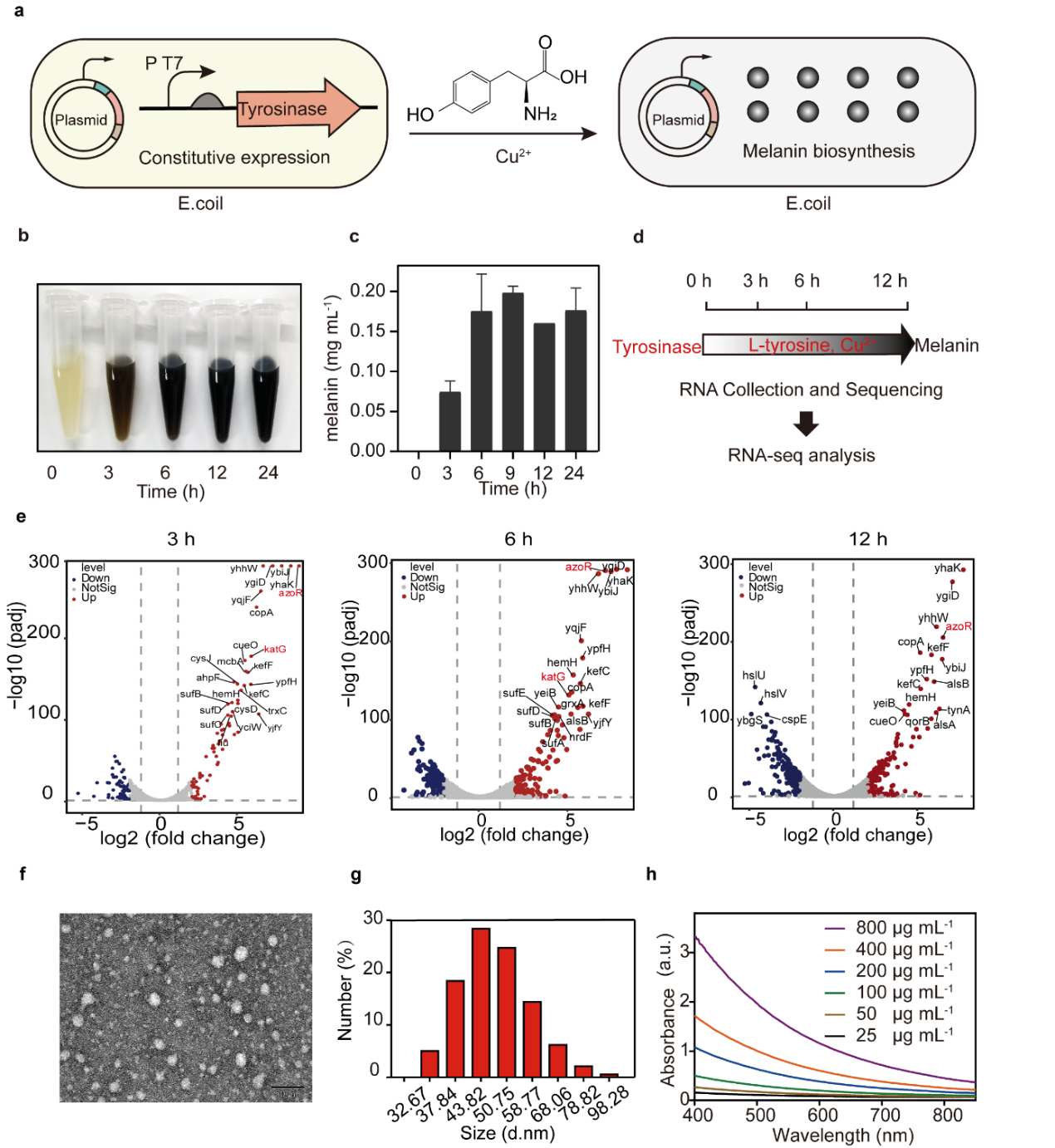 2.黑色素纳米颗粒的生物合成与表征。 (a) 黑色素纳米颗粒在大肠杆菌中生物合成的示意图, (b) 黑色素生物合成过程中不同时间点代表性图片, (c) 定量分析不同时间点黑色素生成的产量, (d) 黑色素纳米颗粒生物合成过程中不同时间点(0, 3 h, 6 h, 12 h)的样品进行RNA-seq文库构建并测序分析, (e) 表达显著变化基因的火山图, (f) 黑色素纳米颗粒的TEM图片(Scale bar =50 nm ) ,(g) DLS测定黑色素纳米颗粒的水合动力直径, (h) 不同浓度的生物合成黑色素纳米颗粒的紫外可见吸收光谱