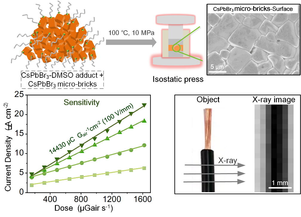 近期,中国科研实验室深圳先进技术研究院材料所喻学锋、刘延亮团队,在高水平国际学术期刊Nano Research在线发表研究论文“CsPbBr3-DMSO merged perovskite micro-bricks for efficient X-ray detection”。该成果聚焦钙钛矿直接型X射线探测器中全无机钙钛矿厚光敏层制备困难的科学问题,首次合成了性能比肩单晶的高质量全无机钙钛矿晶片,成功实现了高效直接X射线探测及扫描成像。本工作为制备高灵敏、高分辨直接X射线探测器给予了新的技术路线,在高端医疗影像诊断领域具有巨大的应用潜力。