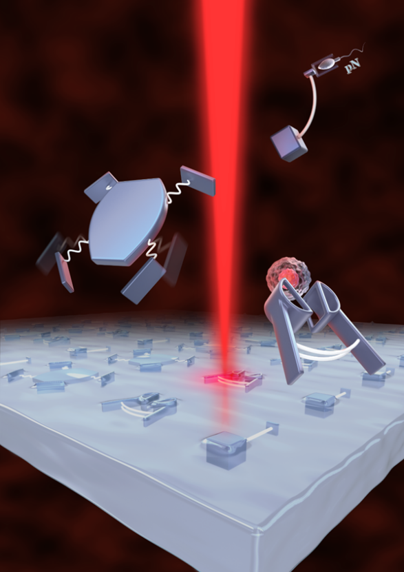 弹簧是人类认识的最早的能量转换器件。小至钟表、扭秤,大至汽车悬挂、原子力显微镜,无一不是使用弹簧组织作为其关键部件而来。可以说弹簧丰富了人造机械的多样性。在微观世界中,细胞和微生物也使用弹性组织来执行力感知、捕食、驱动等动作。把弹簧的应用推广到微观世界,而发明出具备弹簧组织的微纳器件是人类长久以来的一大构想。虽然弹簧的应用历史悠久,但能应用于细胞力学的大应变微米弹性器件却面临挑战。其关键困难在于细胞相容性弹性材料的高精度3D加工。此前,徐海峰团队分别开发了弹簧触发的抗癌精子机器人以及抗血栓的精子火车机器人。研究发表在ACS NanoAngewandte Chemie等顶级期刊,被Science、MIT Technology Review、美国国家广播电视等多家期刊和媒体报道(链接见文末)但前期的微米机器人的力感知精度较差,且无法达成细胞的自由操纵。