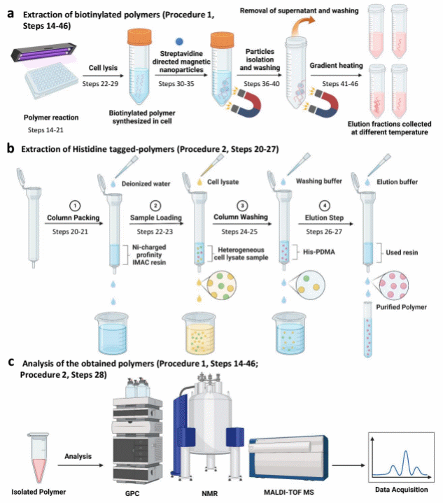 根据胞内大分子聚合物的特定特性以及它们所在的细胞,团队开发了两种方法来分离这些聚合物进行结构和性质表征。包括生物素-链霉亲和素生物偶联功能化的磁性纳米颗粒和固定化金属亲和色谱法(IMAC)。