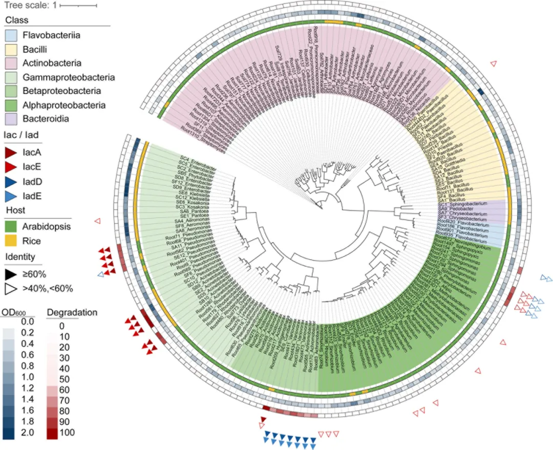 基于这些研究问题,研究团队第一时间运用比较基因组学与体外降解实验相结合的方法,系统性评估了从拟南芥(Arabidopsis thaliana)和水稻(Oryza sativa)根部分离的183株细菌的IAA代谢能力。最终鉴定出来自7个属的共21株细菌具有IAA降解活性,其中包括之前未被报道过的新菌属(图1)。