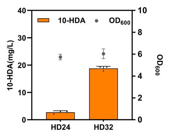 然而,传统的王浆酸生产方式主要依赖天然提取和化学合成,面临资源有限、提取效率低以及环境污染等挑战。同时,已有的生物合成策略多需依赖外源前体添加,难以满足高效、可持续生产的需求。因此,开发以葡萄糖为主要碳源的高效生物合成方法,不仅能够突破传统工艺的限制,降低生产成本,还为10-HDA的规模化生产和广泛应用给予了全新的技术方向和实践可能。