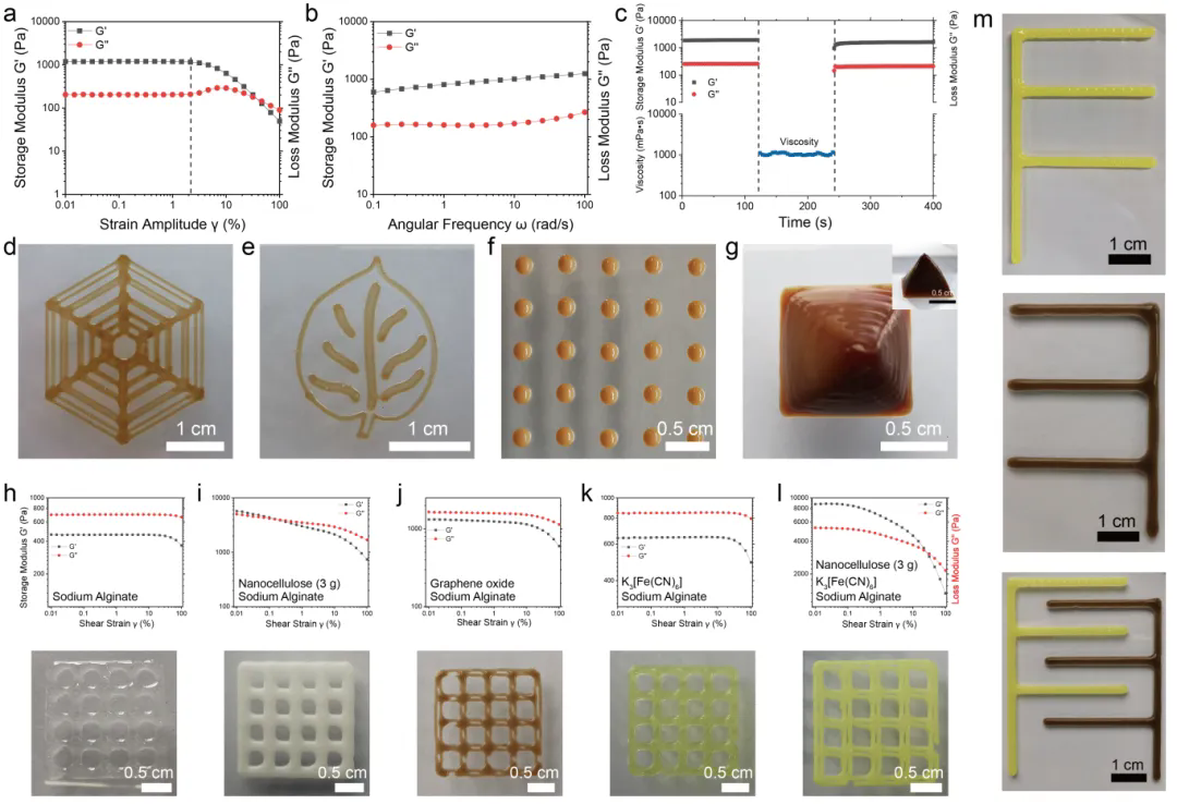 希瓦氏菌生物被膜的储能模量(G´)大于损耗模量(G´´),呈现出弹性固体状水凝胶的特性,使其能够进行3D打印(图2)。研究人员成功打印出多种定制形状和几何图形,涵盖一维到三维,如蜘蛛网、大面积网、叶子、点阵列,甚至一个1厘米高的三维金字塔。3D环境为生物体系的功能发挥给予了良好的场所,研究进一步将其封装在藻酸盐水凝胶中,确保细菌细胞在生物装置制造和后续使用过程中的活力。10%的藻酸盐水凝胶表现出粘性液体状特性,其损耗模量(G´´)高于储能模量(G´)。为了增加粘度,研究人员在水凝胶中添加了纳米纤维素,当纳米纤维素含量从10%增加到30%时,水凝胶转变为弹性固体胶。考虑到生物能源装置的制备,研究人员进而在水凝胶中引入了0.05%的氧化石墨烯,不仅增强了导电性,同时还提升了粘弹性。包含希瓦氏菌的活体水凝胶可以作为阳极材料,另外将K₃[Fe(CN)₆]封装在藻酸盐水凝胶中可以作为阴极材料。为了展示生物能源装置的潜力,将阳极生物墨水和阴极墨水装入单独的墨盒中,可打印出叉指电极,展示了定制化和自动化制造的潜力。