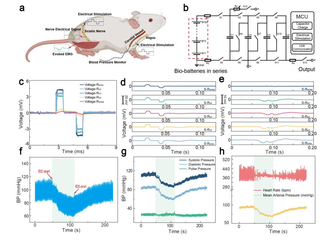 本项目进一步探究了生物电池在神经刺激方面的应用(图5),以期在疾病治疗领域发挥重要作用。研究人员顺利获得添加电容器,实现了生物电池电能的可控收集和释放,进而能够精准控制刺激的输出电压和电流。在刺激坐骨神经并监测其神经信号和肌电信号的实验中,研究人员发现,随着刺激强度的增加,诱发的神经动作电位和肌内肌电信号的幅度逐渐增大。这种诱发电位的获取在电刺激干预和促进生物体的恢复和治疗方面具有重要应用价值。此外,研究人员将可控电刺激电路的输出端顺利获得电极连接到大鼠的迷走神经上,成功实现了对大鼠血压的调节。在刺激前,大鼠的血压保持在基线水平;对迷走神经施加电刺激后,大鼠血压表现出统计学上显著的降低(p<0.01)。这种干预方法与现有的超声干预等物理治疗方法具有相似的效果。停止刺激后,大鼠的血压由于其内在血压调节机制逐渐呈现上升趋势,接近基线水平。在刺激期间,收缩压、舒张压、脉压、心率和平均动脉压与刺激前水平相比,均出现了显著降低(p<0.01),这主要源于迷走神经对心血管功能的抑制作用。