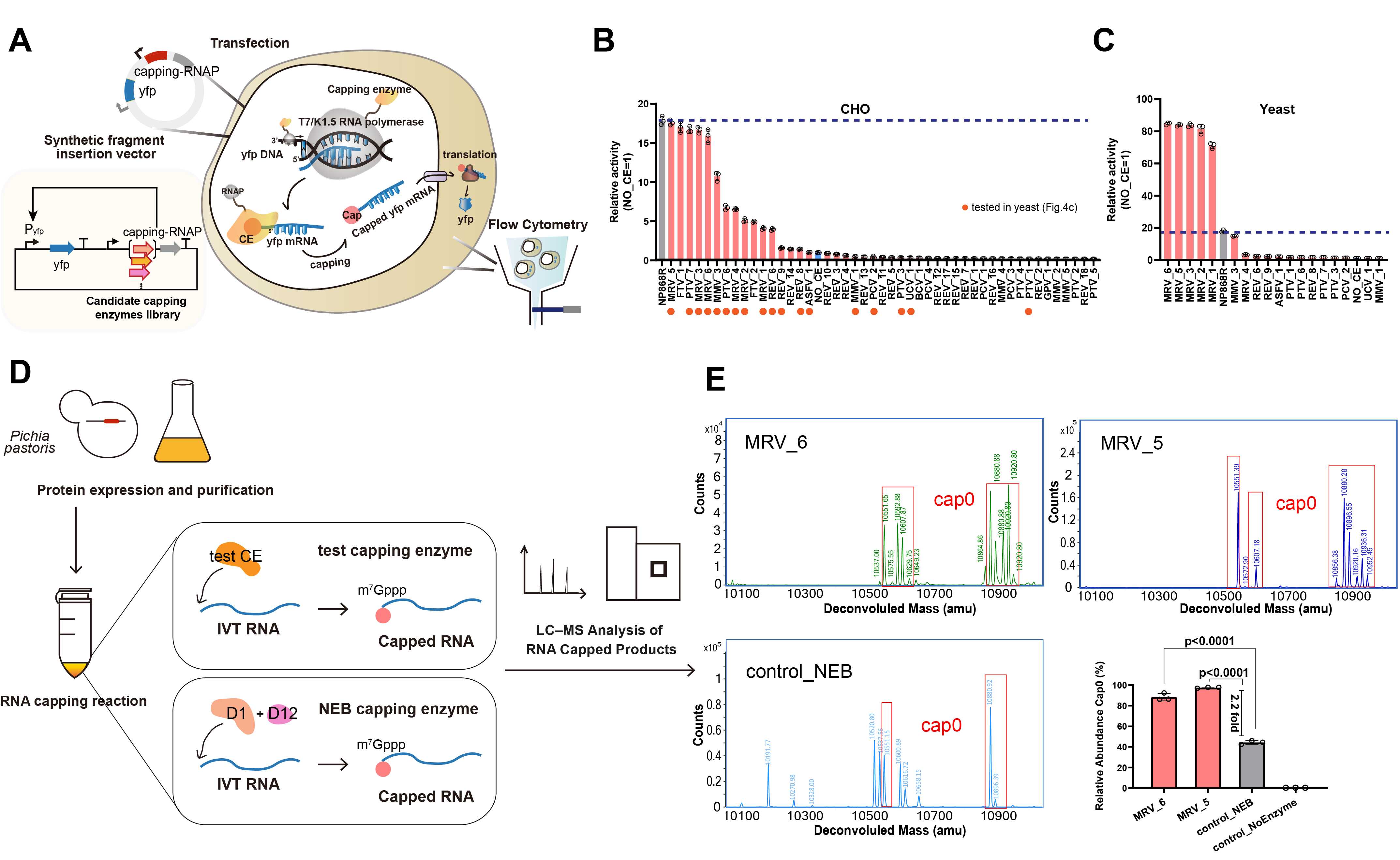 图3. 候选加帽酶在细胞体系和体外转录体系中表现出跨物种、跨体系的高加帽效率