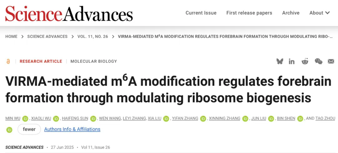 Science Advances | 揭示RNA m6A调控核糖体生成通路参与大脑发育新机制