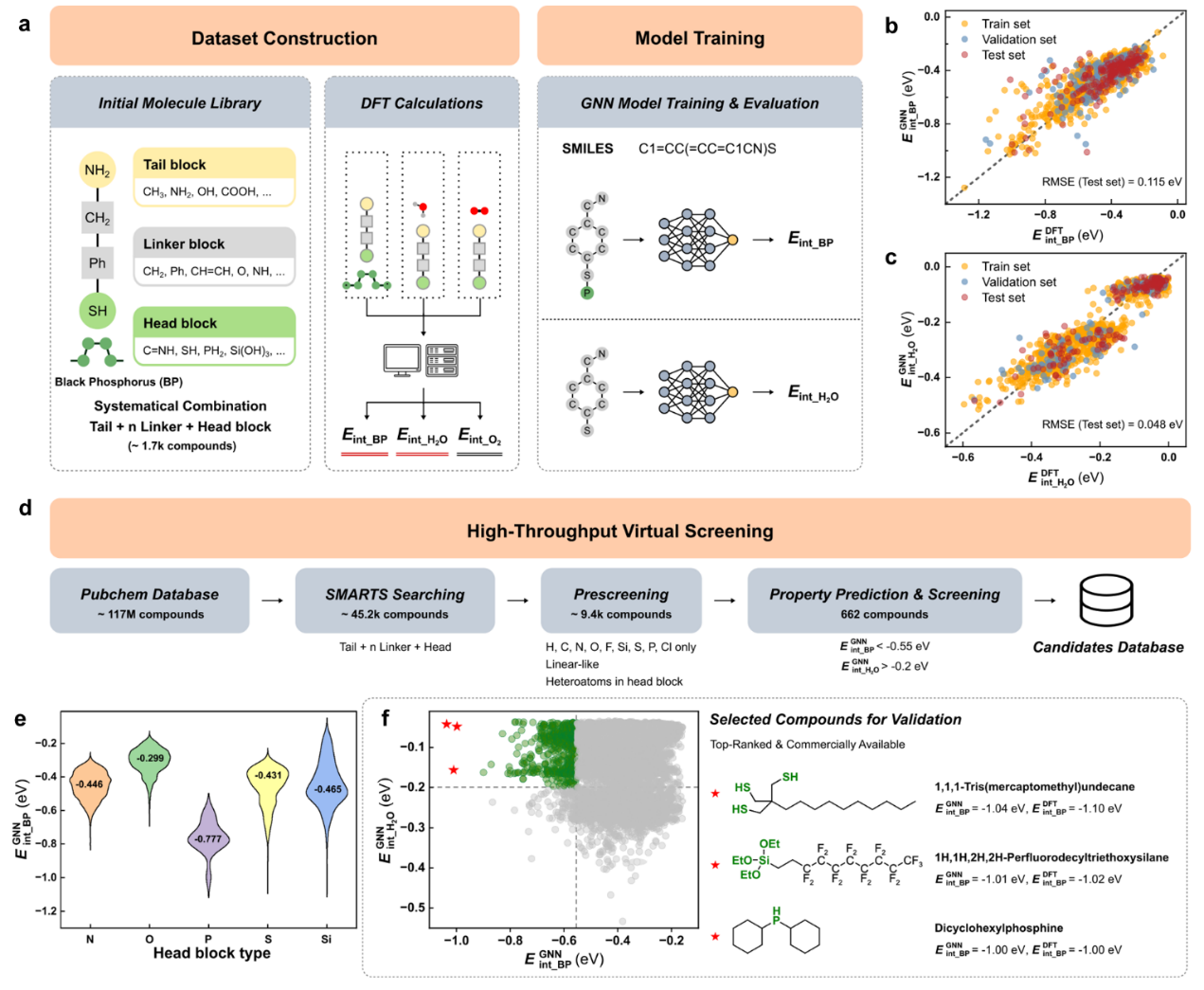2. 数据驱动与分子智能筛选:顺利获得图神经网络模型对1.17亿PubChem分子库进行高通量预测和筛选(图2),快速取得662种候选分子。除了实验已发现的头基含N、O基团的分子外,此AI驱动框架还批量发现了其他含Si、S、P头基类型的候选分子材料。