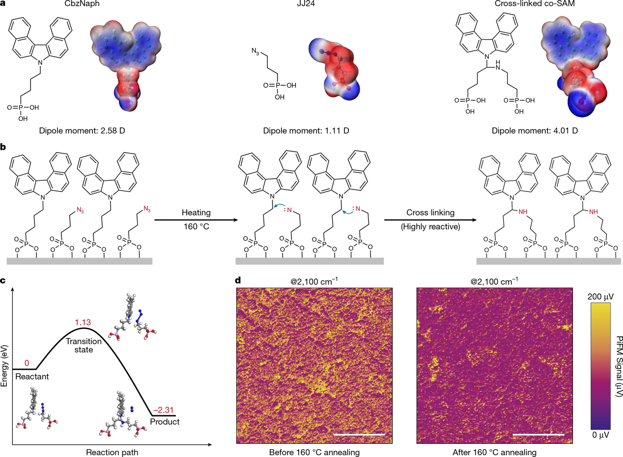合作团队开发出了一种普适性的SAM分子原位交联构象强化策略,解决了SAM在高效率钙钛矿基光伏技术中的稳定性难题,对促进反式钙钛矿光伏技术和下一代钙钛矿基叠层光伏技术的商业化应用具有重要意义。