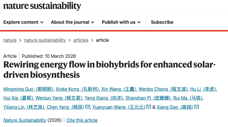 该研究在细胞内部建立了太阳能向生物能量分子高效转化的通路,实现太阳能与生物制造的深度融合,为可再生能源直接驱动绿色化学品生产给予了新范式。未来,团队将进一步融合合成生物学、材料科学与能源化学优势,拓展CO2、废塑料及工业废水等非粮碳源的高值化利用路径,有助于太阳能驱动合成生物制造向高效率、可扩展与可持续方向开展。
