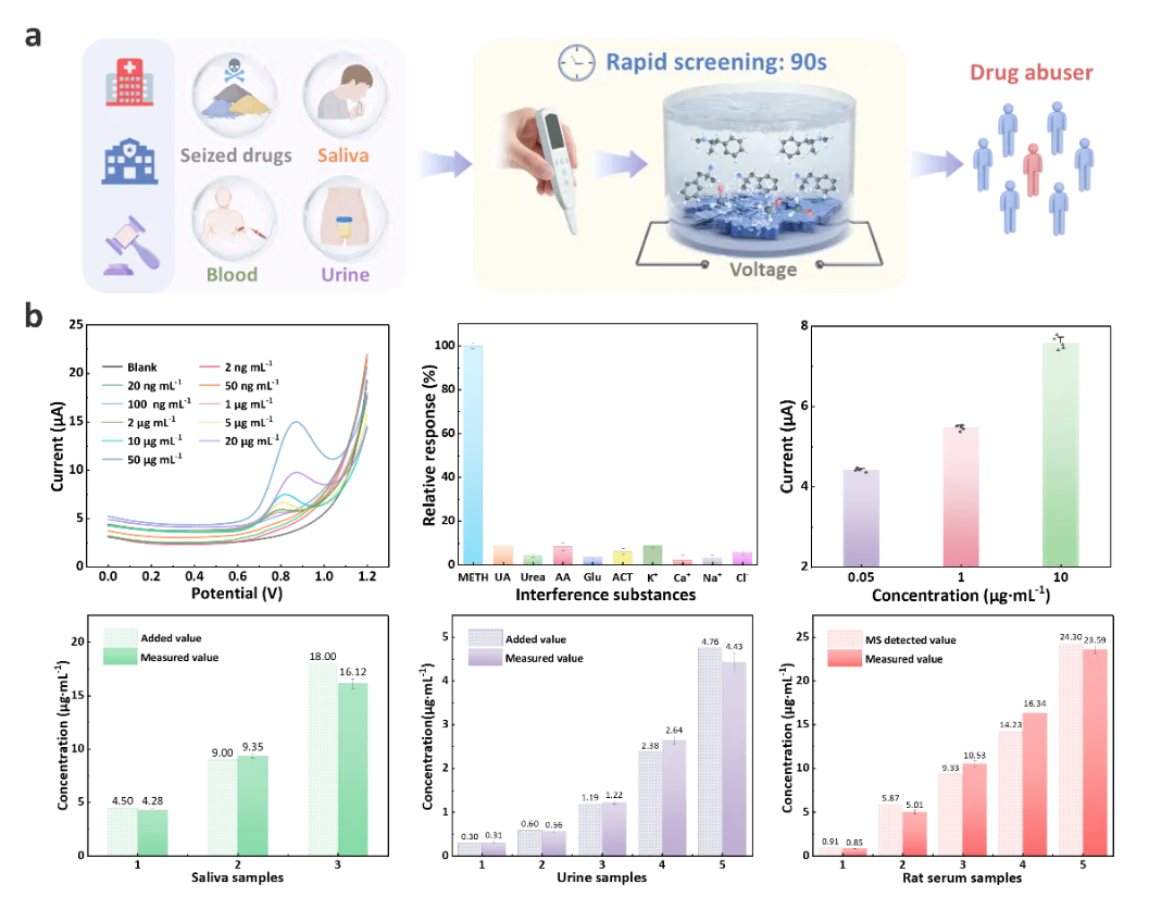 该平台已成功应用于血清、唾液、尿液等微量生物样本中METH的直接定量分析。传感器检测性能满足中国与美国对METH现场初筛的浓度阈值要求,尤其适用于样本量有限、需快速精准定量的执法稽查、毒品监管及公共卫生监测等场景。