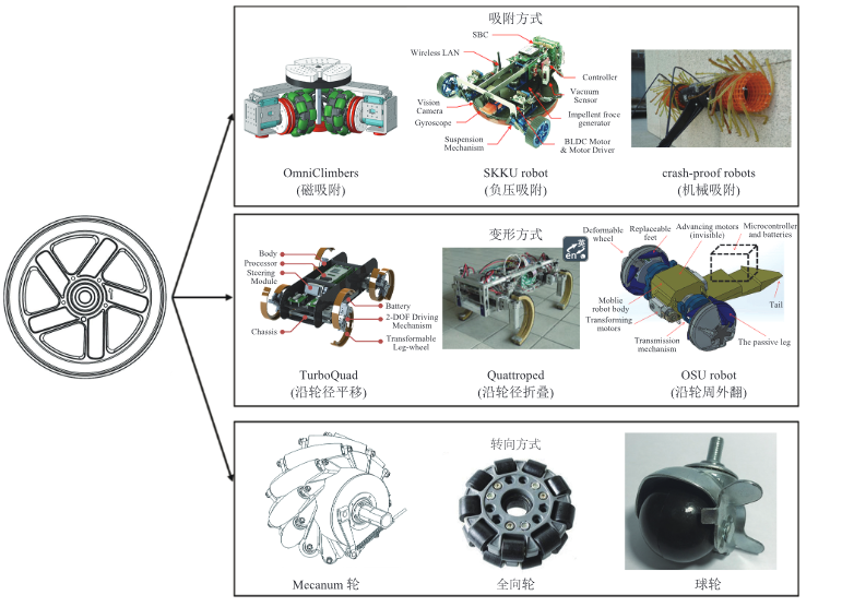 摘要:轮子是人类的一项伟大发明,轮式移动系统为人类的生产和生活带来了极大便利,机器人采用轮式移动系统是一个十分重要的开展方向。为克服普通轮子对复杂地形适应性不足的问题,研究者们在轮子与行驶表面的吸附方式、轮子自身的几何形态、行驶过程中的转向方式等方面进行了探索。在轮子将滑动摩擦转变为滚动摩擦这一移动机理的基础上,针对崎岖地形翻越、垂立壁面爬升、地面全向移动等场景要求,该文提出了三模式变形轮、磁吸附轮、变参数全向轮等 3 类新型轮子结构,及其相应的轮式移动结构;顺利获得连杆组织实现了三模式变形轮在圆轮模式、爪模式、勾模式之间的切换和机器人的双向越障;顺利获得磁吸附轮结构和被动三自由度悬架,使全部轮子始终贴合壁面,实现了机器人的壁面行驶;顺利获得空间组织调节辊子安装角参数,使轮子摩擦力方向受控,保障了机器人的全向行驶;顺利获得样机搭建和实验研究,验证了该文所提创新设计的可行性。